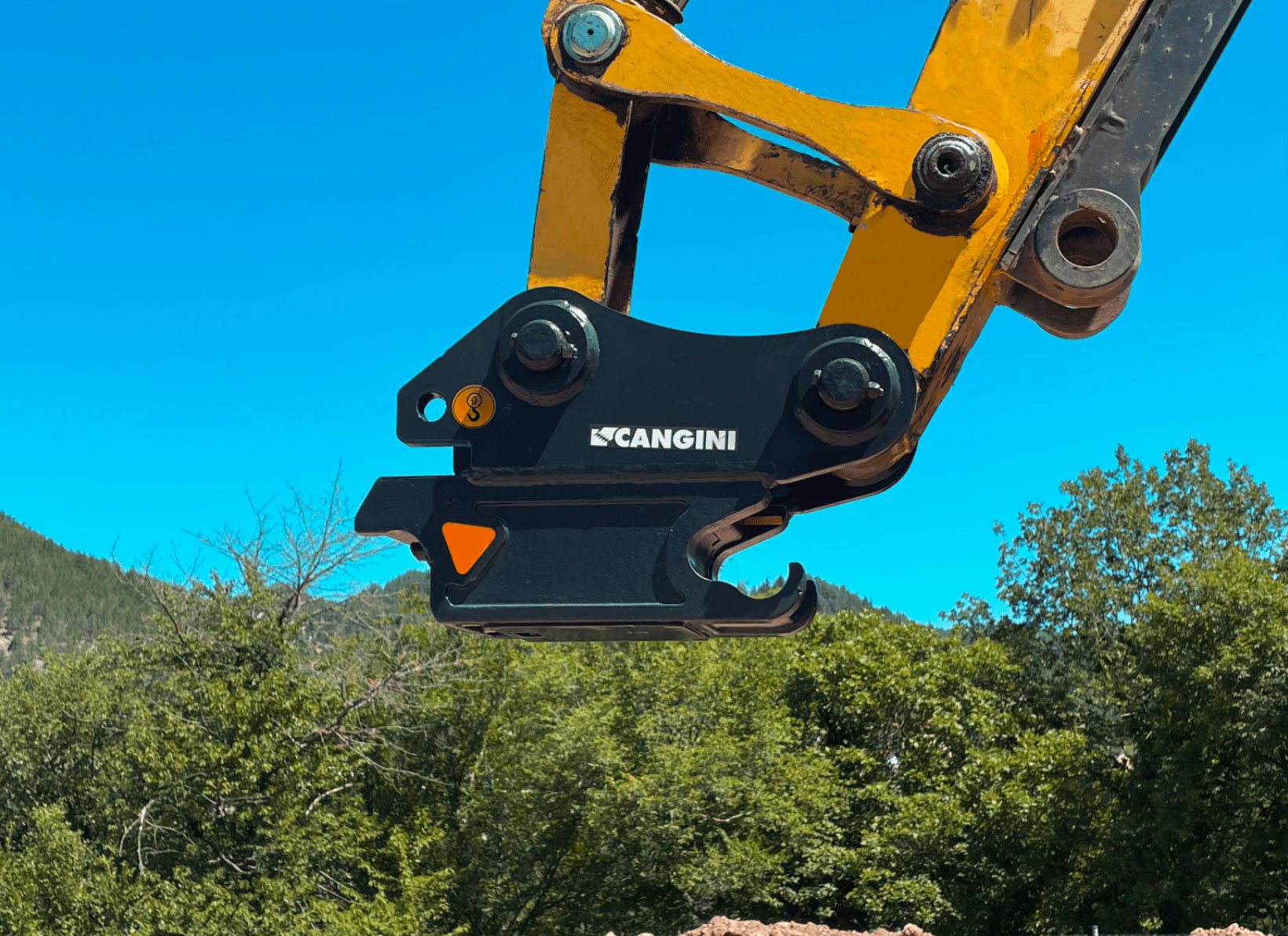 Attacco rapido Cangini montato sul braccio di un escavatore durante un’attività di lavoro in cantiere.