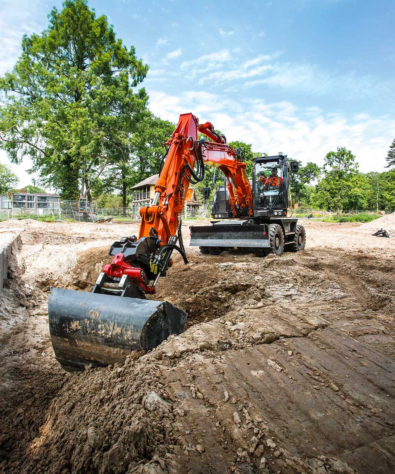 È il più grande e performante della categoria. I suoi 20.100 kg sembrano poca cosa al motore, un Isuzu 4 tempi, common-rail, aspirazione turbo a geometria variabile. La benna a colmo va da 0,51 a 1,20 m³, rendendo quest’escavatore in grado di spostare volumi significativi di materiale. Profondità di scavo fino a 6.300 mm, sbraccio massimo di 10.280 mm e forza di strappo della benna rendono il ZX220W-7 perfetto per penetrare terreni compatti anche in presenza di materiali resistenti. Tra i suoi punti di forza: il sistema idraulico HIOS III, espressamente progettato per migliorare produttività e contenere i consumi. Concorrono poi a farne davvero “un grande” l’ampia cabina con visibilità migliorata e ridotti livelli di rumore e vibrazioni, mentre il sistema di innesto attrezzi assicura un’ampia versatilità, utile per chi alterna lavori di scavo, movimento terra e demolizione. ZX220W-7 è il modello ideale per cantieri su strada, lavori infrastrutturali, progetti che richiedono mobilità e potenza allo stesso tempo, ma anche se siete in cerca di una macchina gommata che si avvicini per capacità a escavatori cingolati medio-grandi.